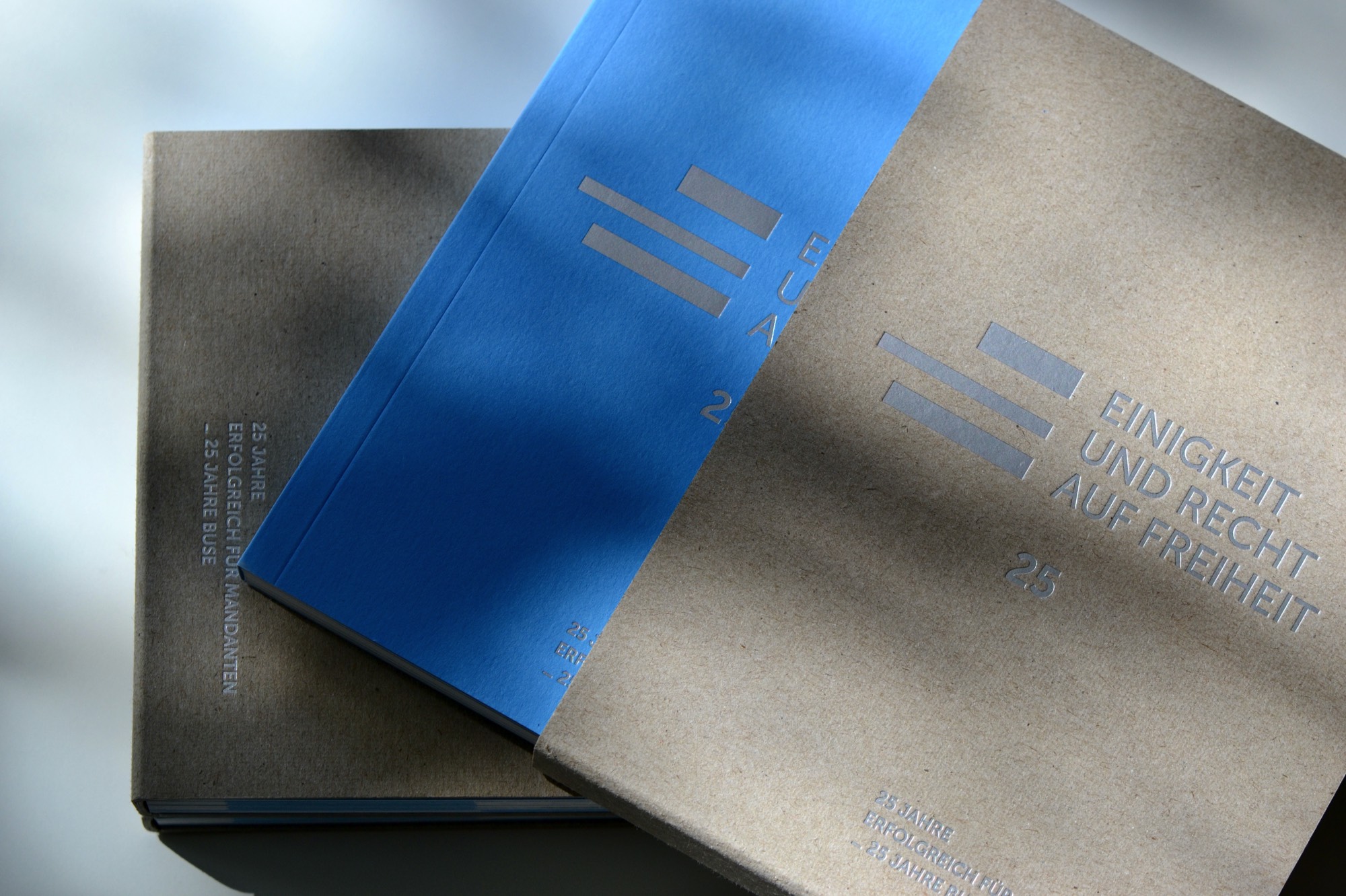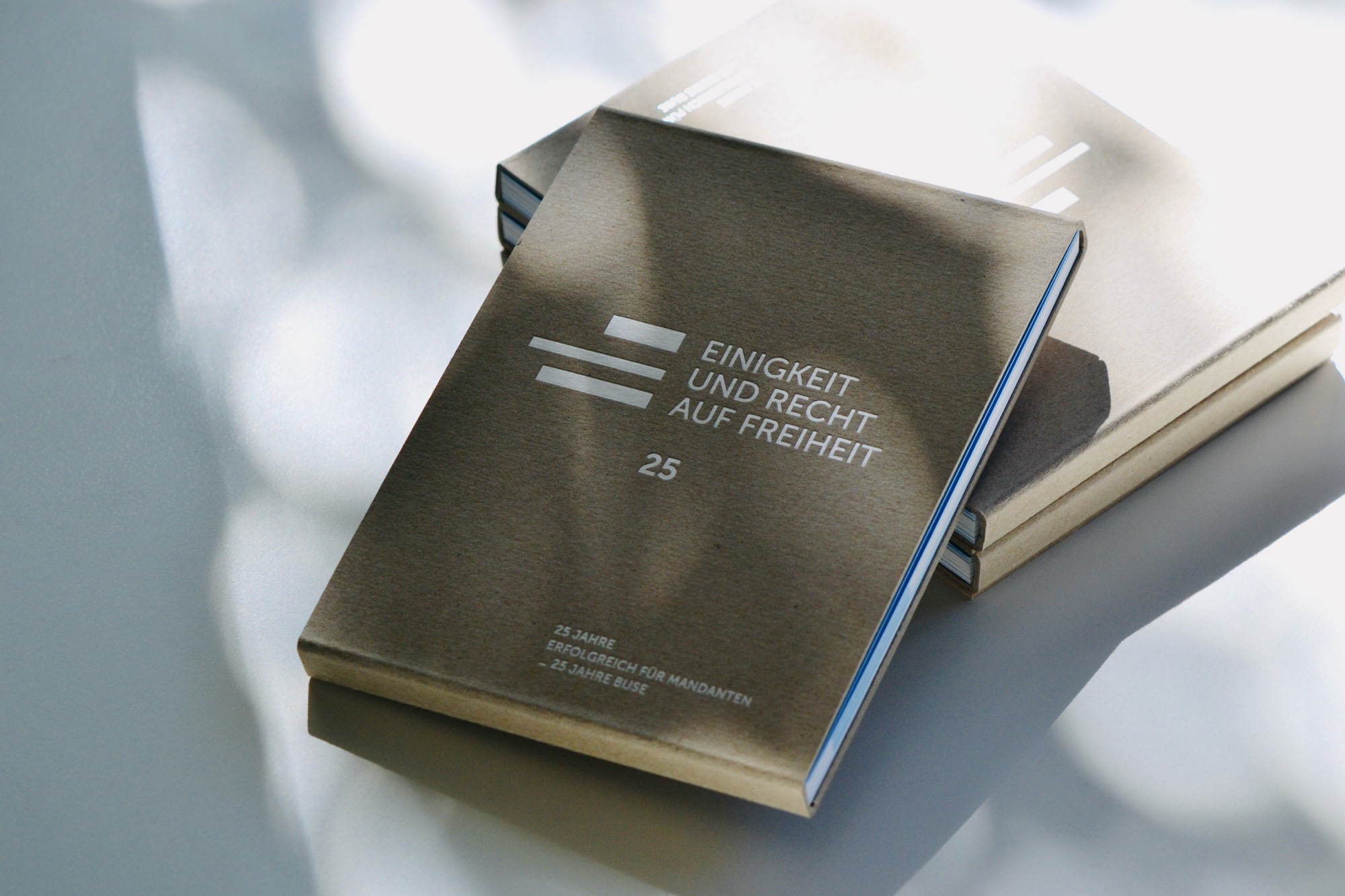 Ein Vierteljahrhundert auf 120 Seiten! Seit 25 Jahren steht BUSE für herausragende juristische Kompetenz und erstklassige Rechtsberatungsdienstleistungen. Zu diesem würdigen Anlass durfte ich der Kanzlei mit der Konzeption und Gestaltung eines Jubiläums-Booklets zur Seite stehen. Auf 120 Seiten werden im erzählerischen Stil Geschichte und Meilensteine der Kanzlei von 1998 bis heute eindrücklich präsentiert. Interviews mit Gründungsnamensgebern, Anekdoten sowie Fundstücke aus dem Kanzleiarchiv vermitteln spannende Einblicke in den Innovationsgeist der Kanzlei. Aktuelle Zahlen und Fakten wurden als Informationsgrafiken aufbereitet und typografisch inszeniert. Die Broschüre in der Kanzleifarbe des bestehenden Corporate Designs – hochwertig verpackt im geprägten Schuber aus Maschinengraupappe – spannt einen Bogen zwischen Historie und neuen Impulsen der BUSE Rechtsanwälte. Im Ergebnis ein haptisches und unterhaltsames Leseerlebnis, das Freude bereitet und für das fortlaufende Engagement der Kanzlei für Exzellenz und maßgeschneiderte Lösungen steht.