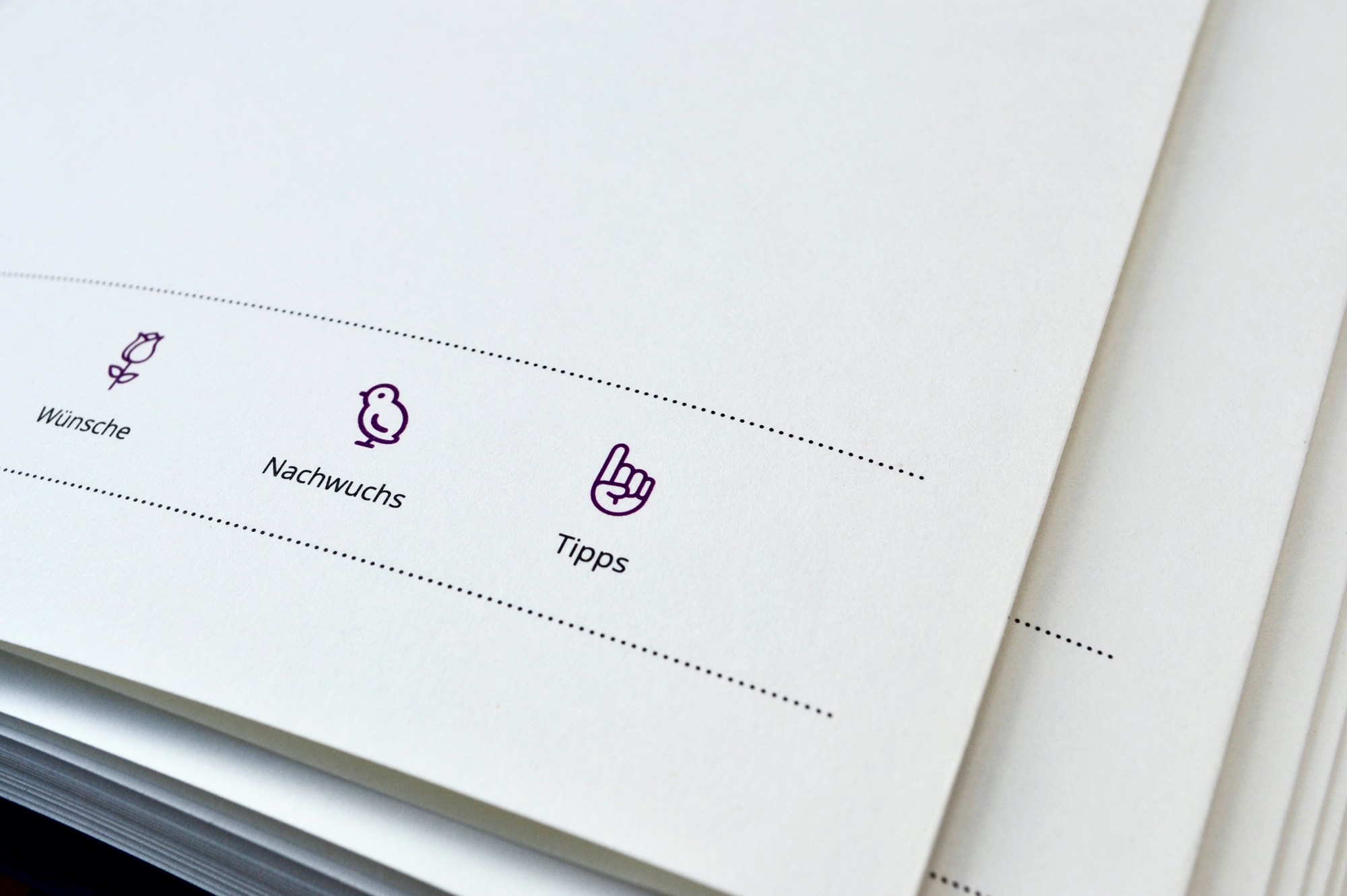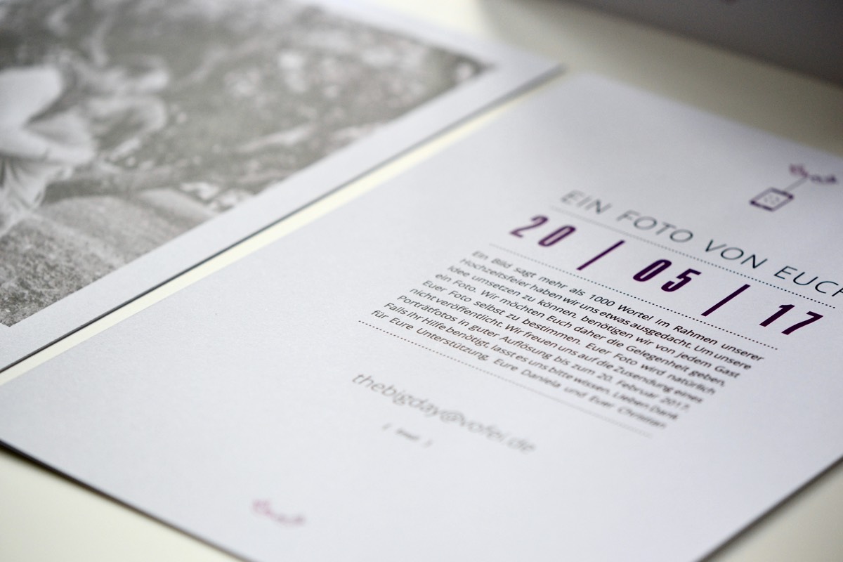 Der Entschluss für ein gemeinsames Leben! Daniela und Christian heiraten! Für das Hochzeitspaar entwickelte ich die zweisprachige Hochzeitspapeterie. Nach der Festlegung einer favorisierten Gestaltungsrichtung suchten wir ein individuelles Motto. Zu Anfang war es nur eine vage Vorstellung, ein Ansatz, Vorlieben, Charaktereigenschaften, Farbpaletten, Stimmungen, Themen, Zitate, der ausgesuchte Hochzeitsspruch …, Danielas Reiselust, ihr Fernweh, Gegebenheiten wie Christians wunderschöner Familienname »Vogelgesang« und das Heiratsdatum im Mai. Aus Ideen und Inspirationen wurde schließlich ein Konzept: »ZUGVOGEL TRIFFT VOGELGESANG« Dieses Thema zieht sich, durch ein Monogramm visualisiert, durch die gesamte Gestaltung und taucht immer wieder auf: zwei kleine Vögel mit den Initialen des Hochzeitpaars vereint in einem Herz. Realisiert wurden Einladungskarte, Infokarte, Fotokarte, Menükarte, Tischkarte, Platzkarte, Danksagung, Who is Who-Broschüre, Gästebuch, Aufkleber, Anhänger und Stempel.