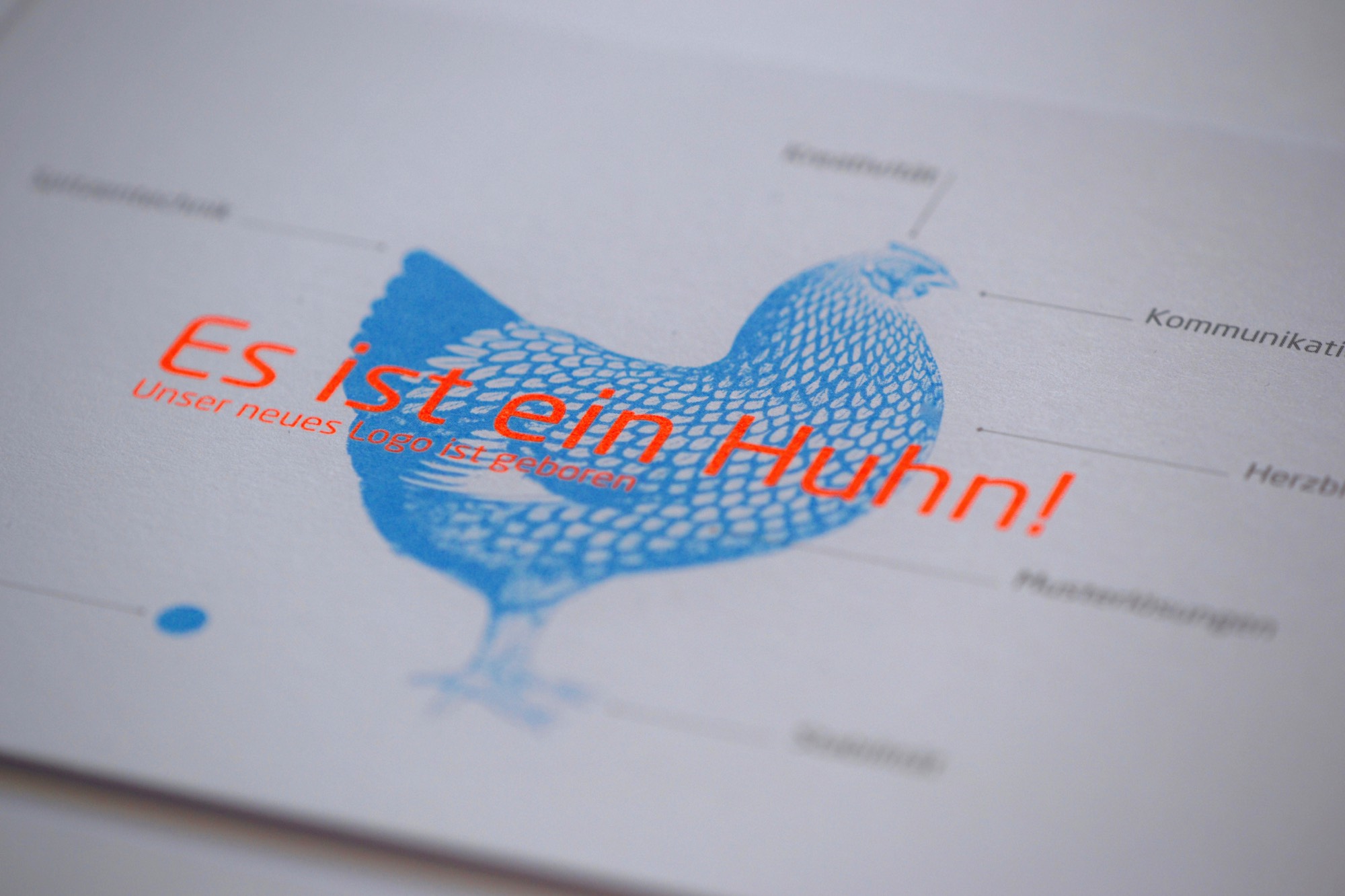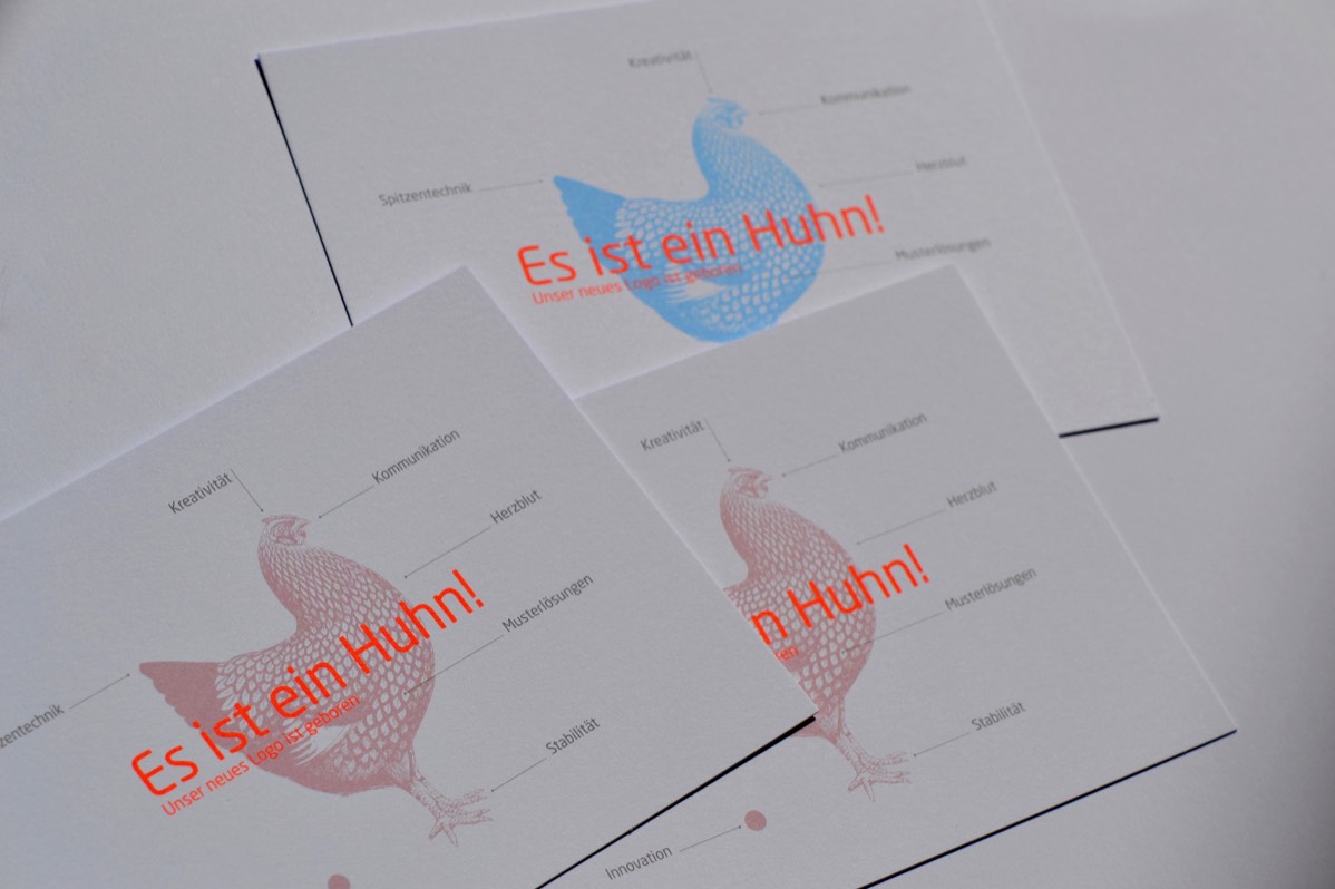 Es ist ein Huhn! Zur Ankündigung des neuen Logos wurden Postkarten in Form von Geburtskarten in hellblau und rosa gestaltet